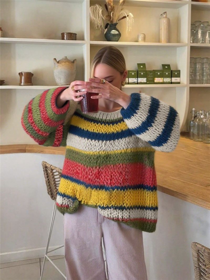 Women Clothing Sweater Rainbow Striped Knitted Pullover Retro Loose Street