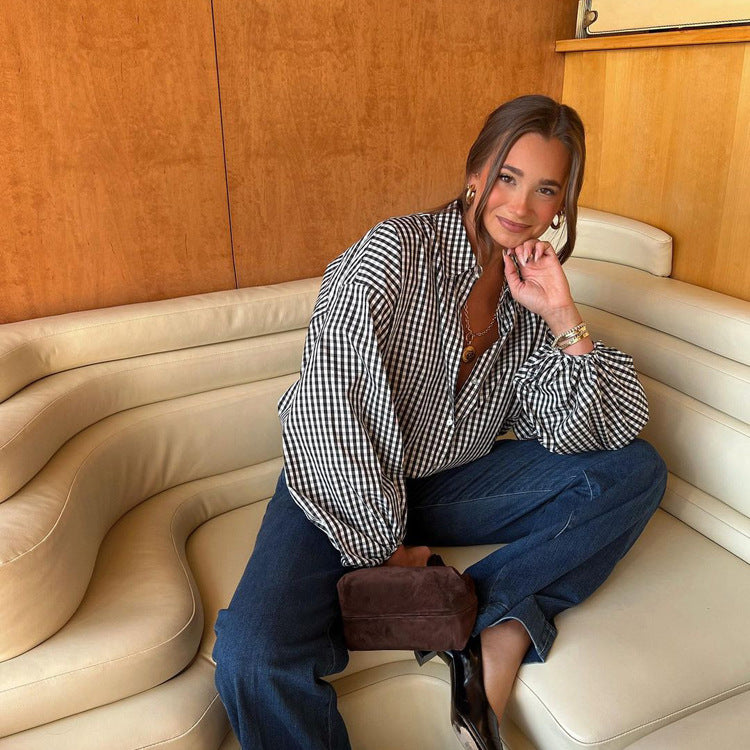Featuring a relaxed, loose fit, this shirt balances a classic collared neckline with feminine lantern sleeves for a touch of refined flair. The timeless check pattern ensures you look effortlessly put together, whether you are heading to a meeting or out for a casual weekend coffee date. Easy to layer and comfortable to wear, it is a versatile staple you will reach for time and again.
