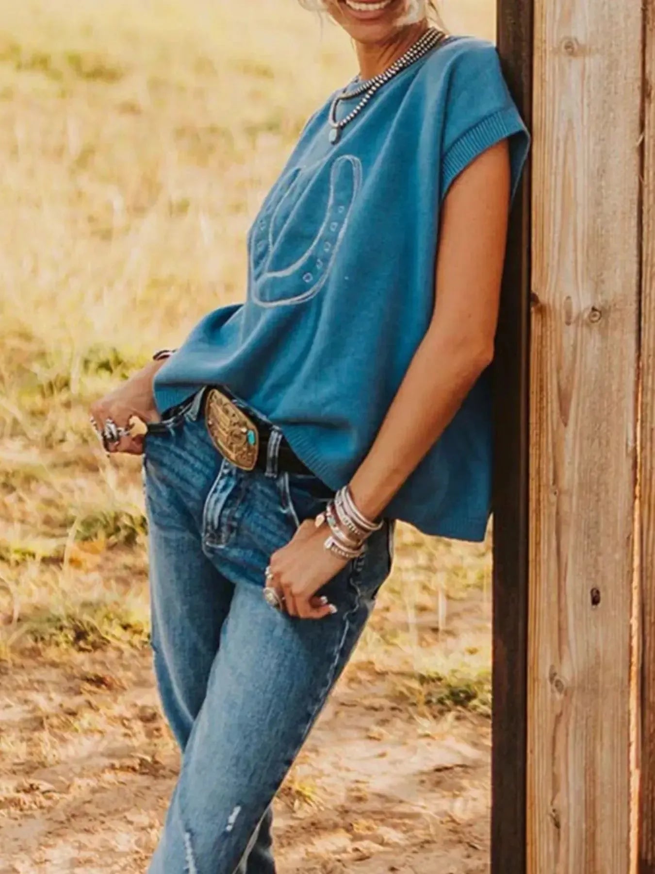 Elevate your everyday wardrobe with our Horseshoe Graphic Round Neck Short Sleeve Sweater, a perfect blend of comfort and effortless style. This versatile piece features a modern silhouette that transitions seamlessly from casual coffee runs to relaxed weekend outings.