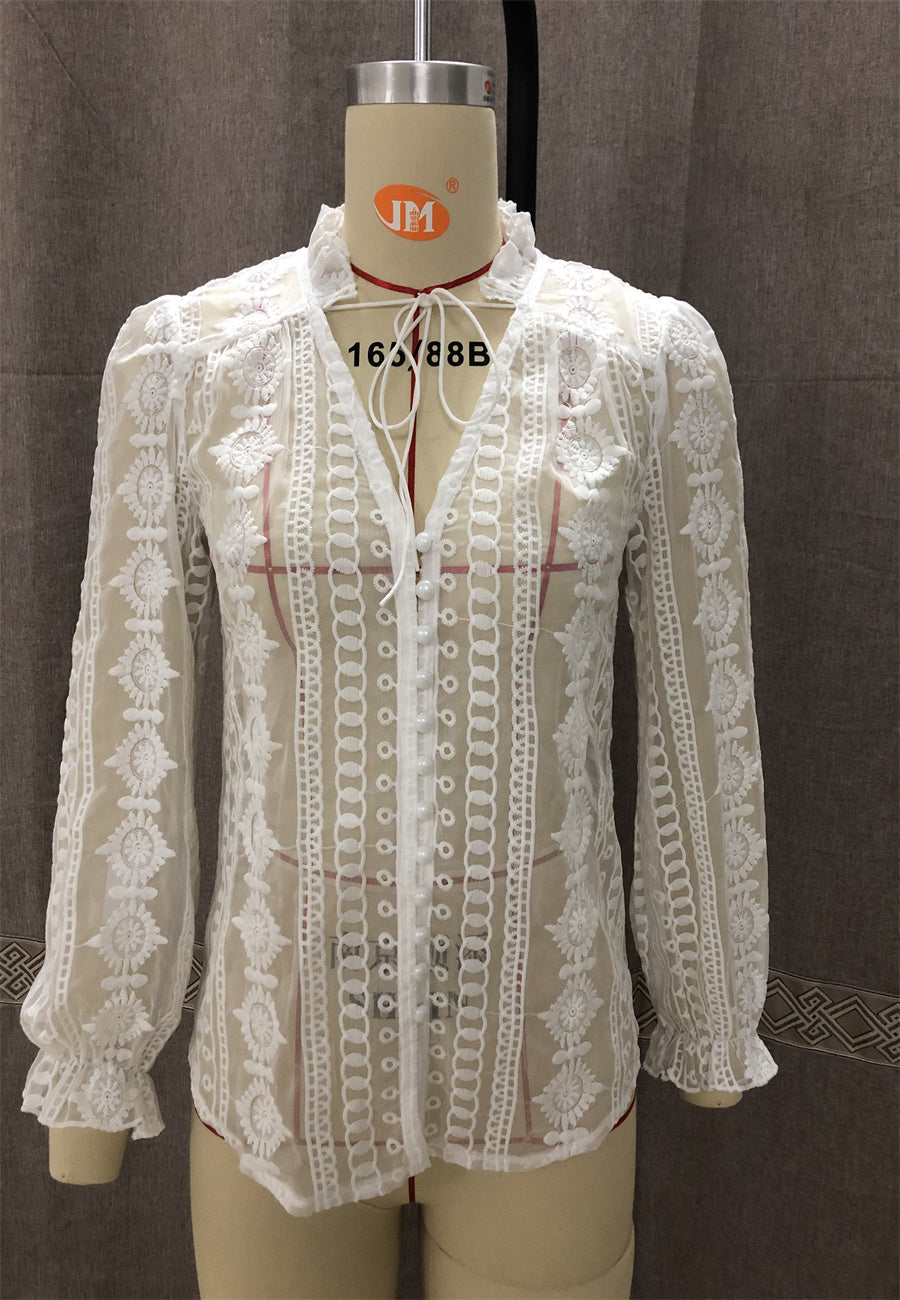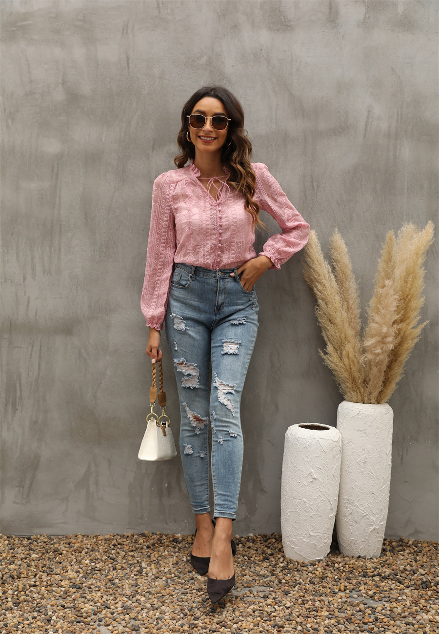 V Neck Embroidery Flower And Wood Ears Long Sleeve Shirt Top Women