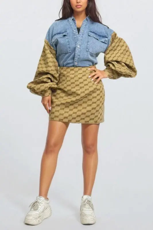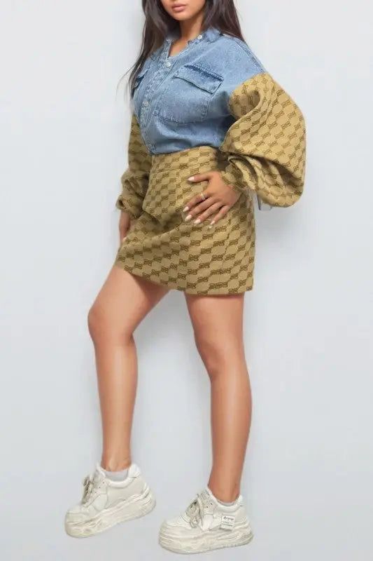 Denim & Monogram Puff Sleeve Two-Piece Set OyeraCharisma