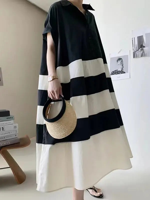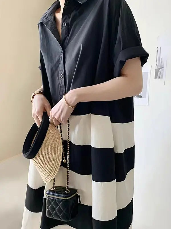 Introducing the French Lapel Colourblock Single-Breasted Oversized Shirt Dress. This stylish piece features a French lapel and single-breasted design, with the oversized fit allowing for unparalleled comfort. A perfect statement piece, the contrast colourblock design provides ample visual appeal. Experience the perfect blend of style and comfort with this must-have dress.