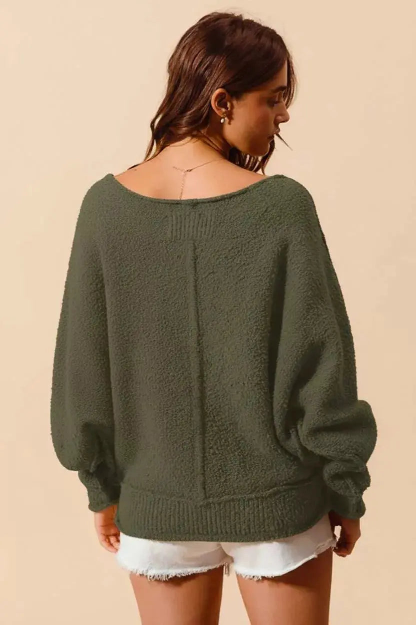 The loose fit exposed seam slouchy bouclé sweater is a relaxed and stylish choice for cozy days. With its exposed seam detailing, this sweater adds a touch of interest and texture to your outfit. The slouchy silhouette offers a comfortable and laid-back look, perfect for casual wear. Made from soft bouclé fabric, this sweater is warm and comfortable for cooler days. Elevate your relaxation style with this chic and effortless loose fit exposed seam slouchy bouclé sweater.
