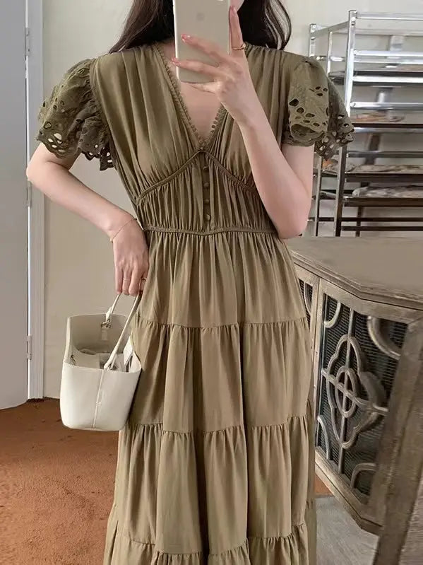 This French Elegant V-Neck Stitching Hollow Lace Dress is perfect for special occasions. The stunning v-neck pattern and intricate detailing of the lace are guaranteed to turn heads. With a fashionable and timeless design, this dress is sure to be a showstopper.
