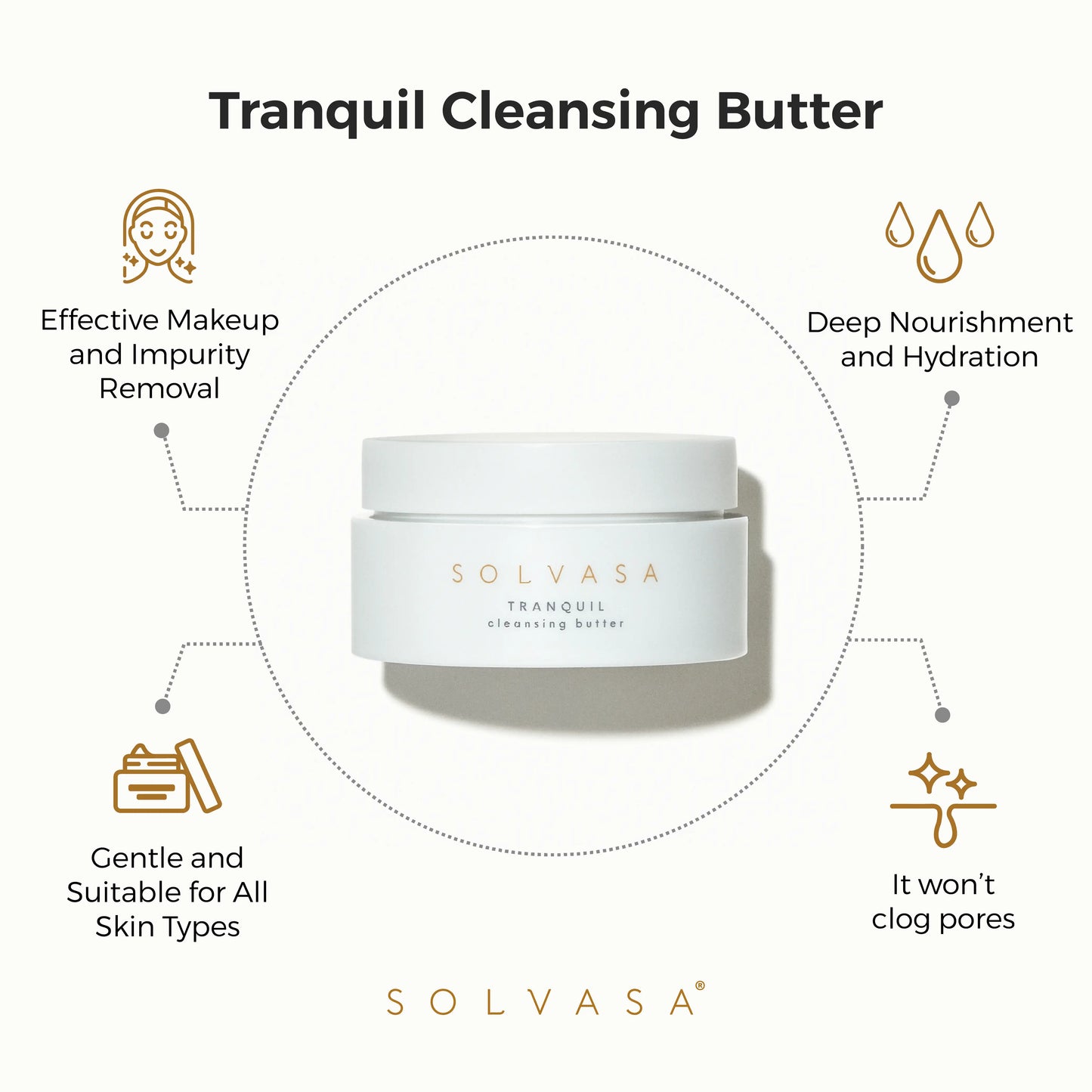 The result: skin that feels dewy and supremely hydrated. Use the Tranquil Cleansing Butter as your bedtime cleanser and overall makeup remover and follow in the morning with the Solvasa Golden Harmony Cleansing Mask for a refined, makeup-ready finish.