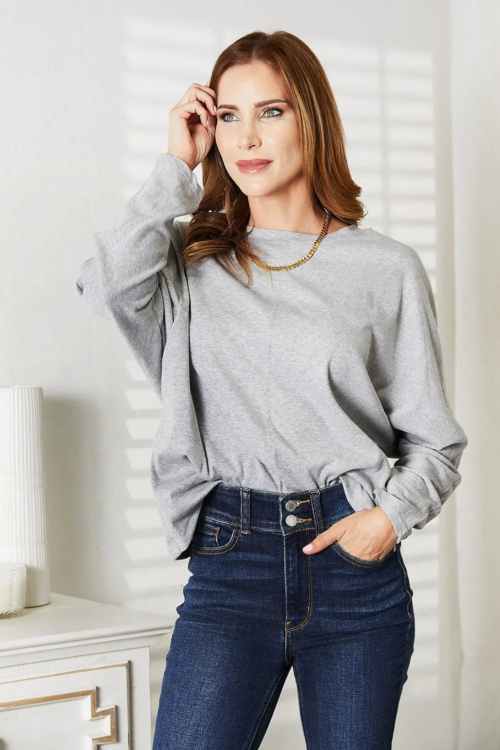 정가 $11.46 USDThis solid long-sleeve top with a round neck is elevated by its seam detail, adding a touch of sophistication to your outfit. It's a versatile piece that can be dressed up or down, making it a wardrobe essential.