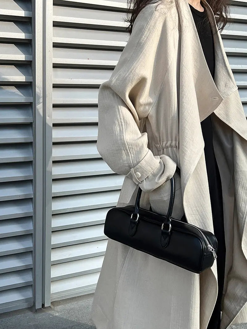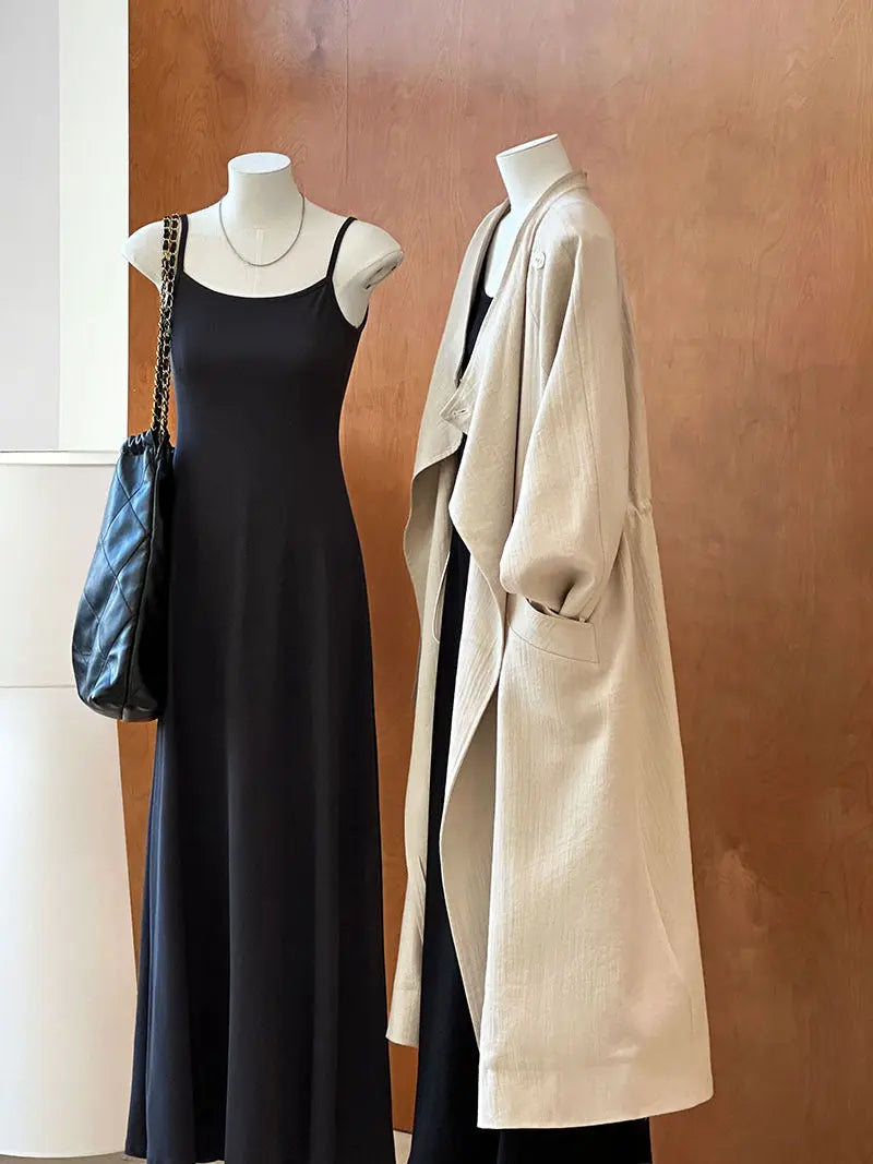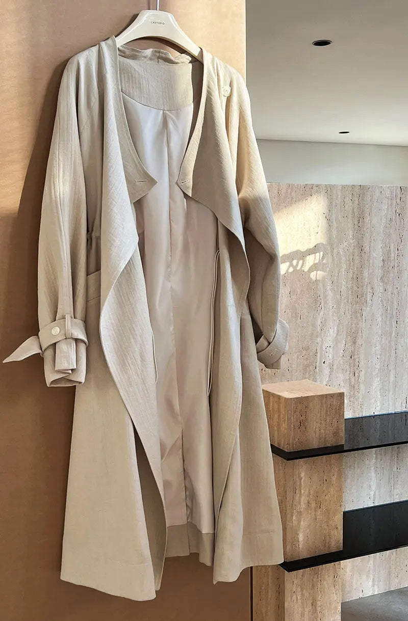 This knee-length drawstring linen windbreaker combines refined tailoring with lightweight comfort. Crafted from breathable linen, it offers an elegant silhouette that protects against mild winds while maintaining a polished appearance. The adjustable drawstring at the waist allows for a customized fit, enhancing its sophisticated design. Ideal for transitional seasons, this windbreaker effortlessly balances functionality and style for the discerning wardrobe.