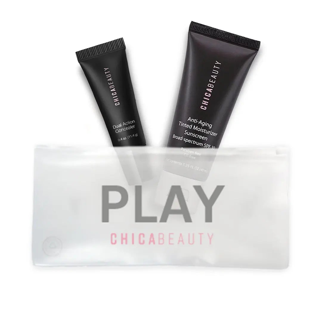 Stay youthful with Chica Beauty’s PLAY set featuring our holy grail 3-in-1 Anti-Aging Moisturizer, Tint and SPF and our brand NEW anti-aging concealer! Chica Beauty knows and understands what it’s like to have a busy and active lifestyle, so we created the PLAY set so you can feel beautiful as you tackle whatever your day may bring! The PLAY set includes products that provide outdoor protection while giving you a natural glow, all while nurturing your face with anti-aging ingredients. These must-have essentials will give you the coverage you need so you can get out there and conquer your day! This set is the perfect grab-and-go solution for girls who want to play...and is sold exclusively on our CHICA BEAUTY website.