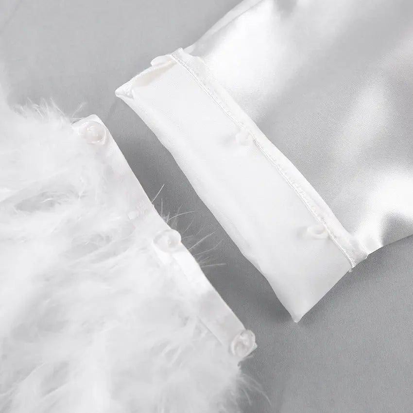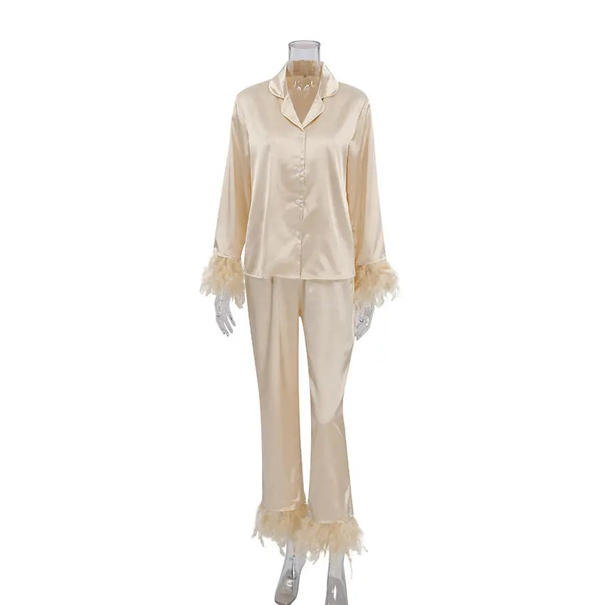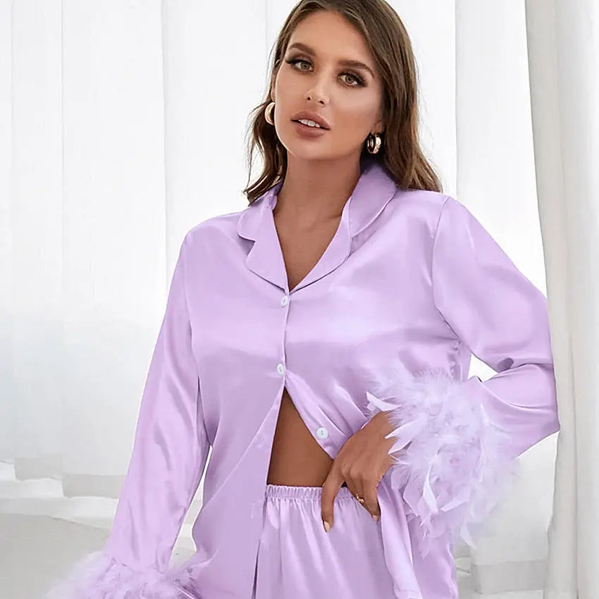 The Heavenly Feathered Silk Pajamas are the definition of elevated comfort. Designed in silky-soft fabric that glides over the skin, this set features delicate feathered trim detailing for that ultra-feminine, glam finish.