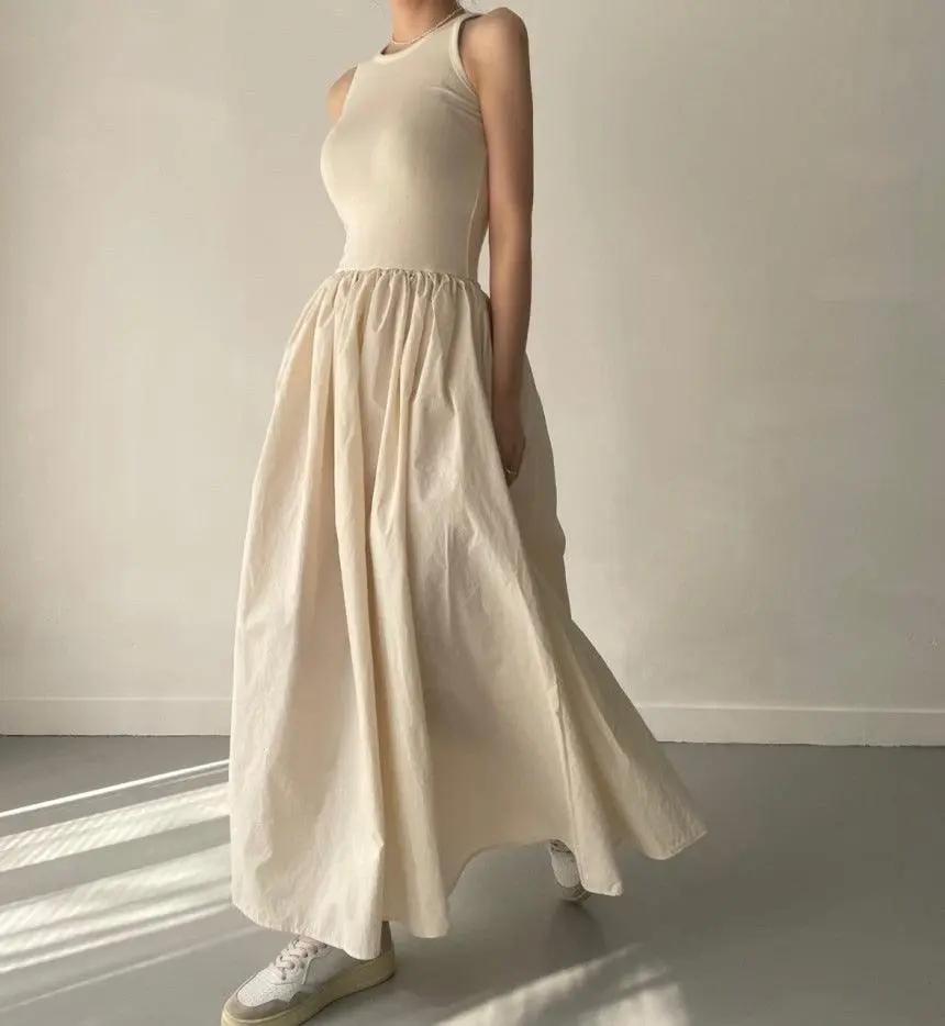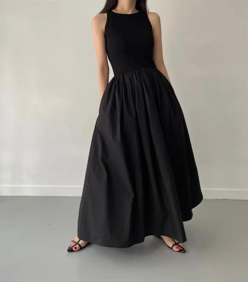 Elegant Round Neck Waist Slim Pleated Long Dress PAINEVIDA