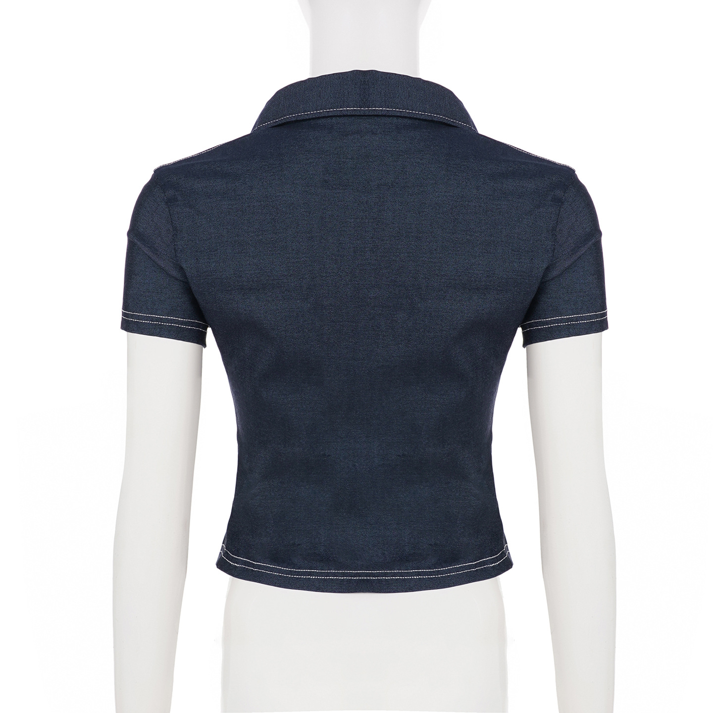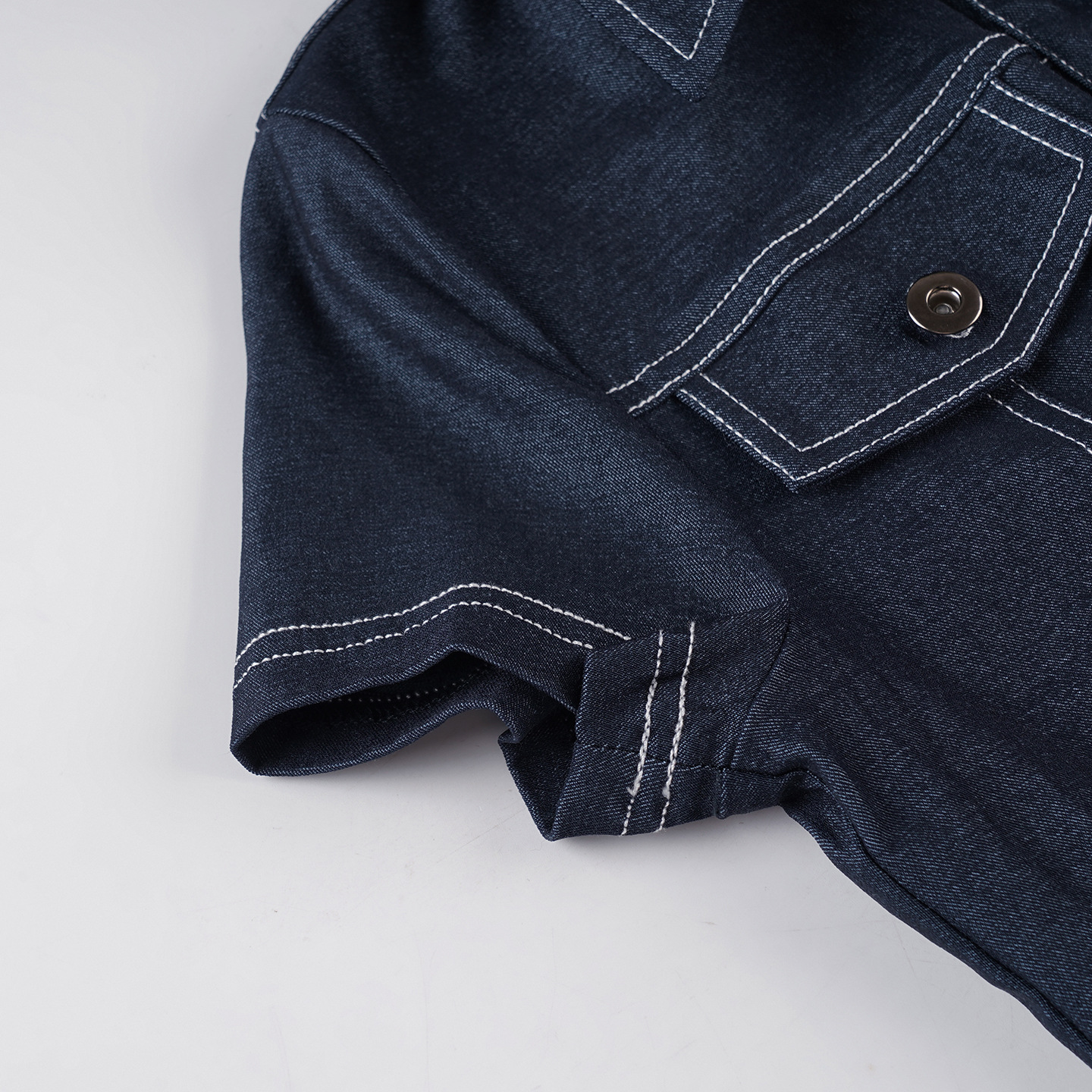 Women Clothing Street Tooling Imitation Denim Slim Pocket Lapels Slimming Short Sleeve Shirt Women