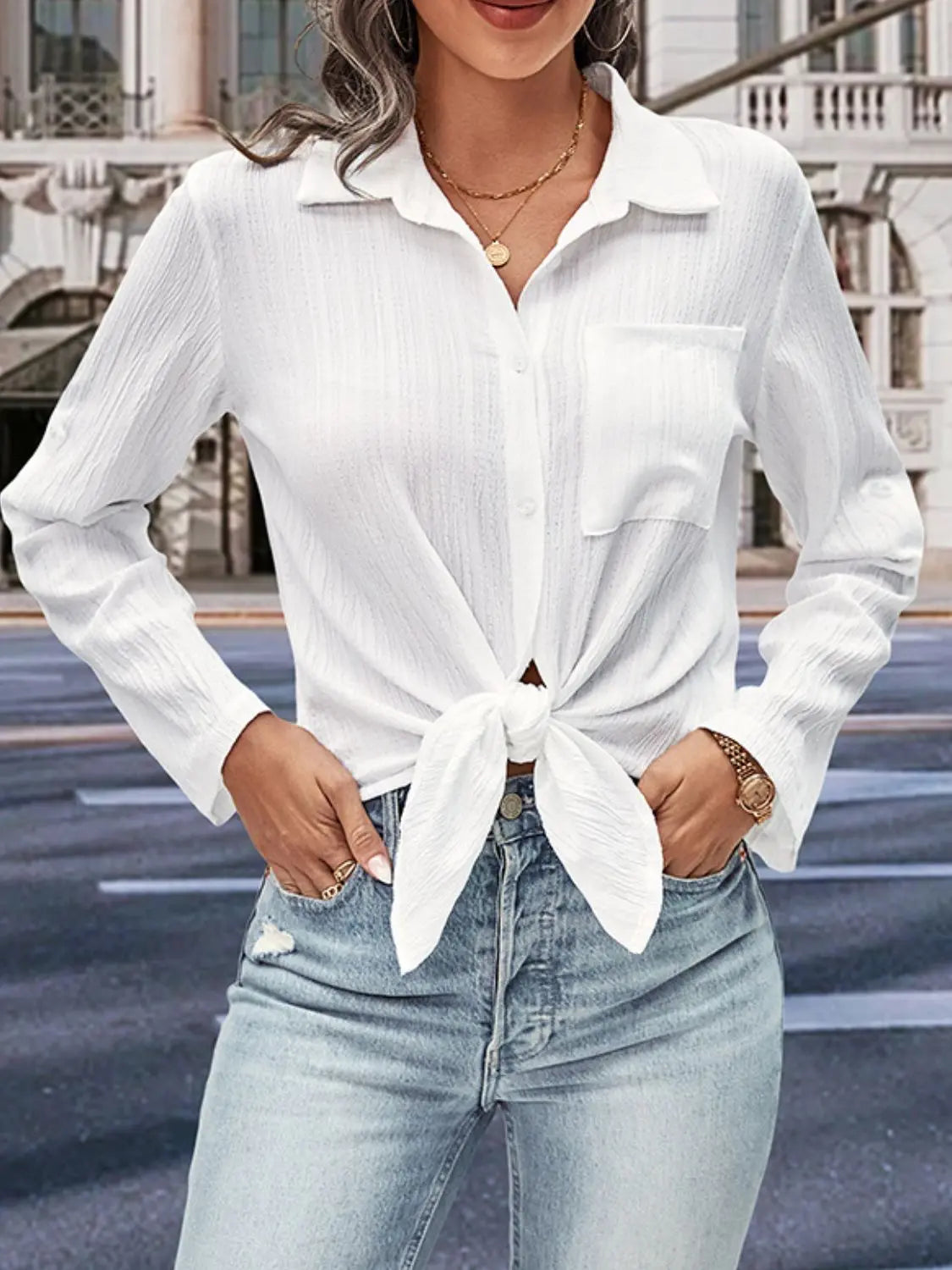 Crafted from premium, high-quality 100% polyester, this shirt offers a soft, semi-sheer luster paired with remarkable durability. The fabric’s lightweight construction ensures breathability and comfort, making it an ideal garment for any season. Designed with luxurious features that set it apart — the distinctive twisted front detail gracefully accentuates your silhouette, while the sophisticated collared neckline provides an effortless polish that transitions seamlessly from office meetings to weekend brunches. Additionally, roll-tab three-quarter sleeves deliver versatile styling options, letting you customize your look with ease and comfort throughout the day.
