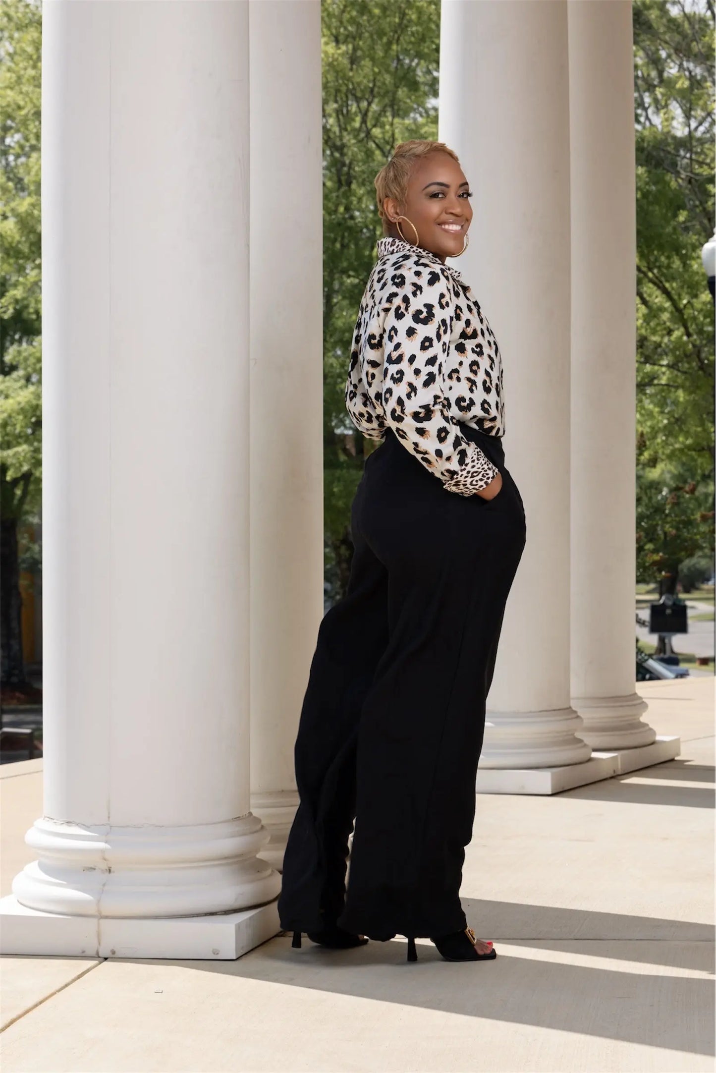 Make a bold yet classy statement in this silky leopard print blouse. Featuring contrast cuffs and collar, it’s the perfect mix of fierce and refined. Ideal for work or a night out. Tuck it into high-waisted trousers for an effortlessly chic look.