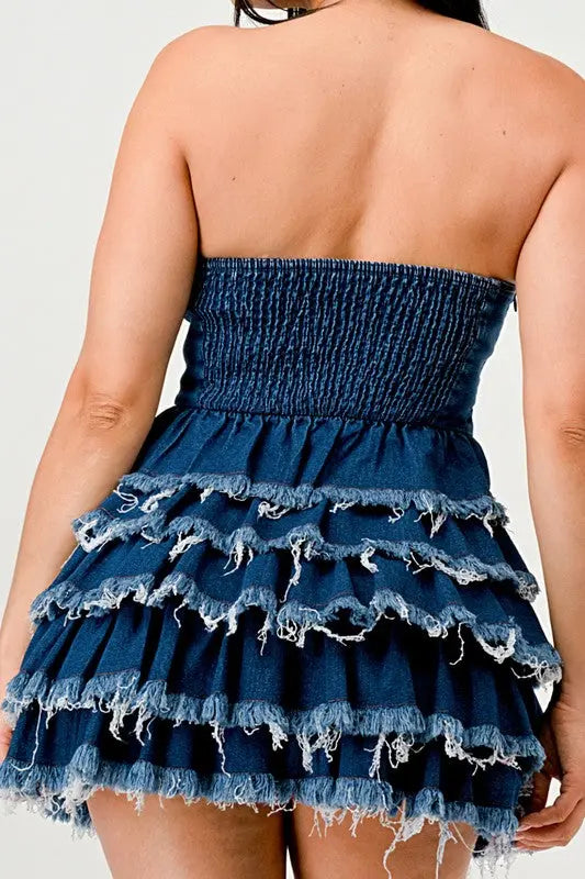 Introducing the "Denim Delight Tiered Ruffle Dress" - a playful and chic statement piece that combines the casual appeal of denim with the femininity of ruffles. This strapless dress features a fitted bodice that accentuates the silhouette, while the multi-tiered ruffle skirt adds a flirty and dynamic movement. Each layer is artfully frayed to give a modern, edgy touch to the classic denim look. The dress is fastened in the back with a concealed zipper, ensuring a seamless and flattering fit. Perfect for a day out in the city or a casual evening event, this dress pairs beautifully with strappy heels or even your favorite sneakers for an effortlessly stylish ensemble.
