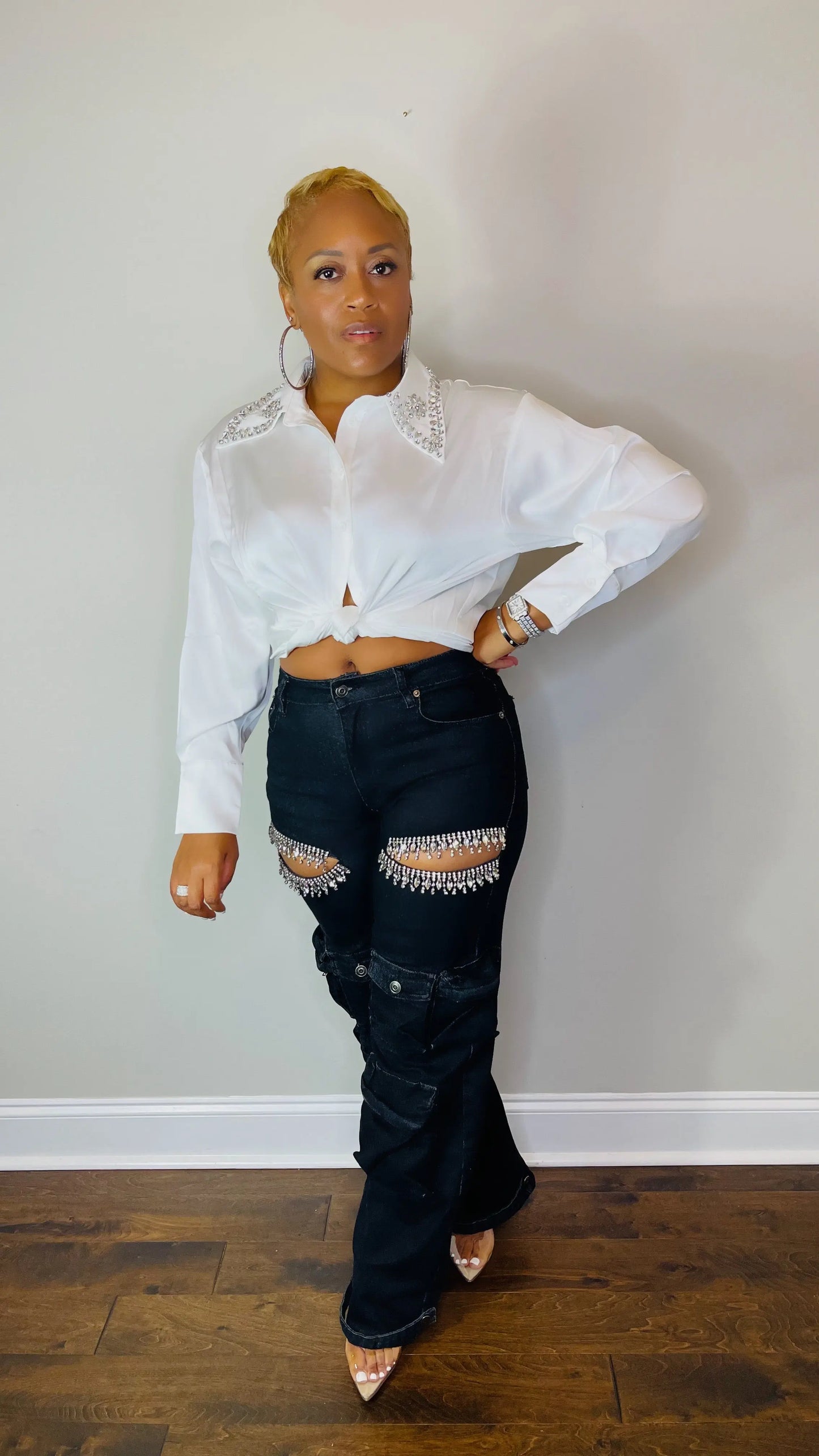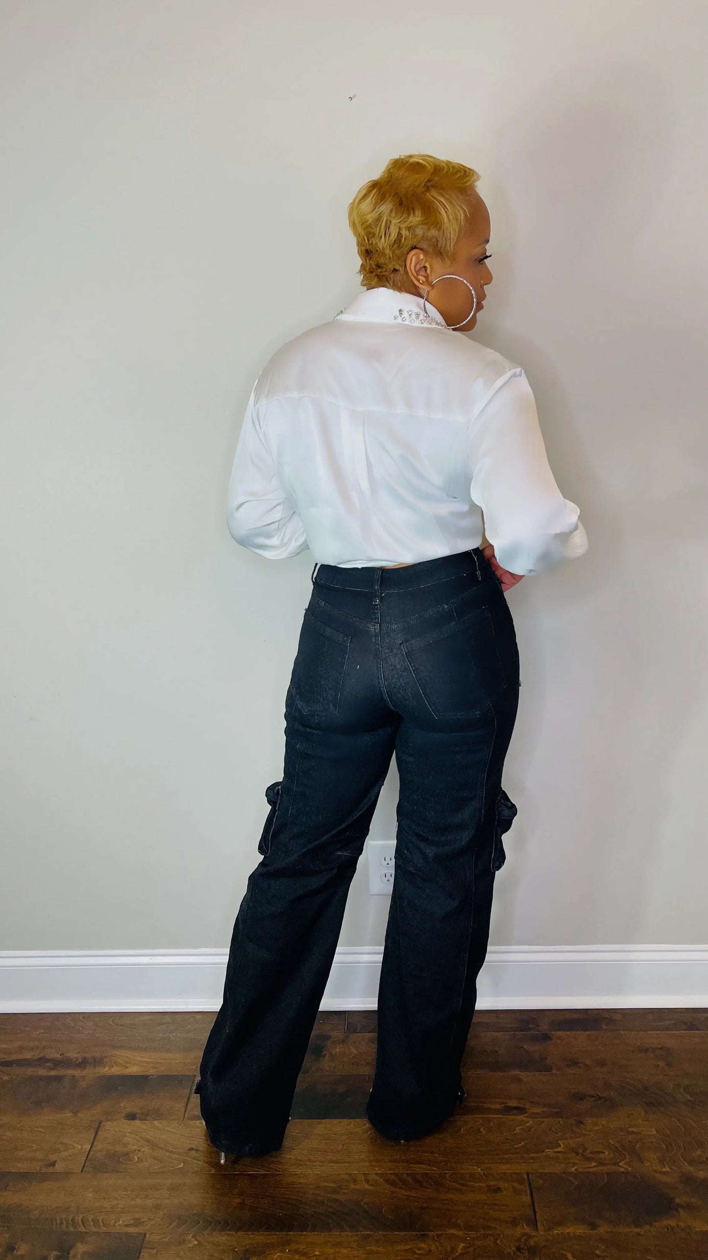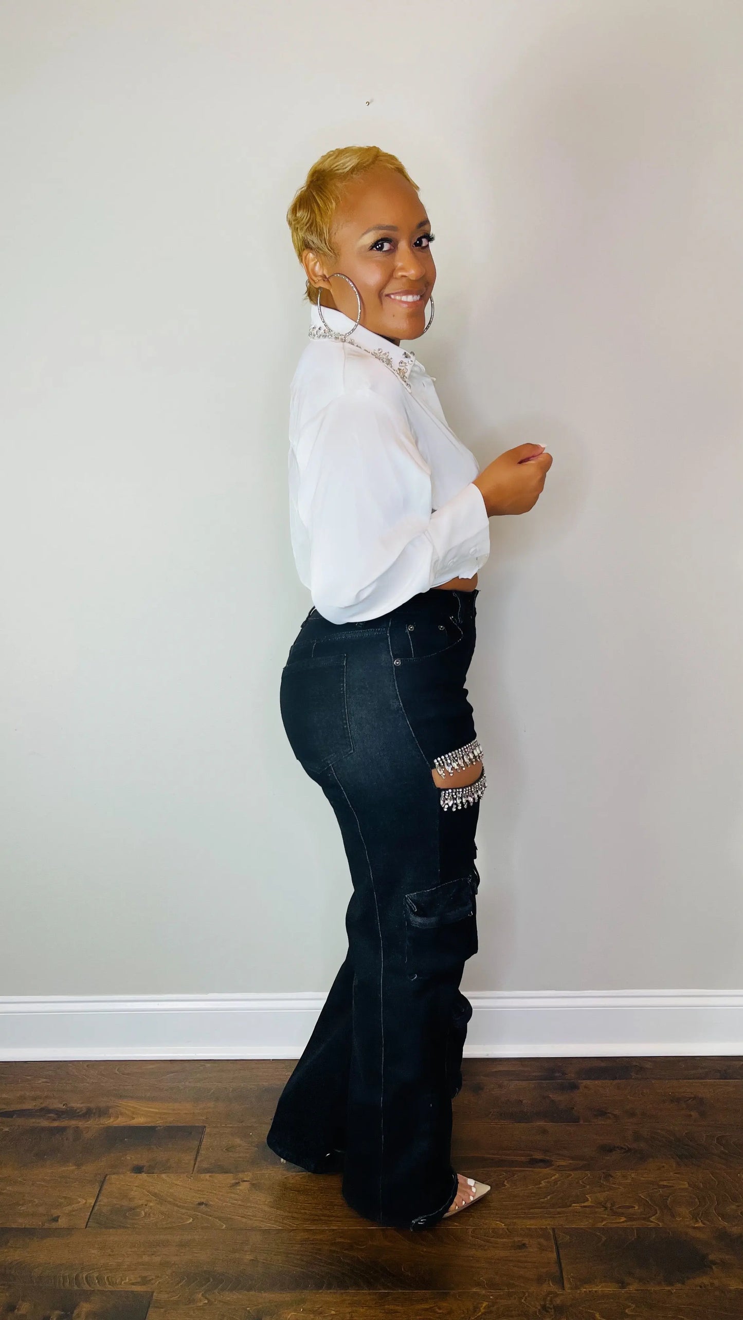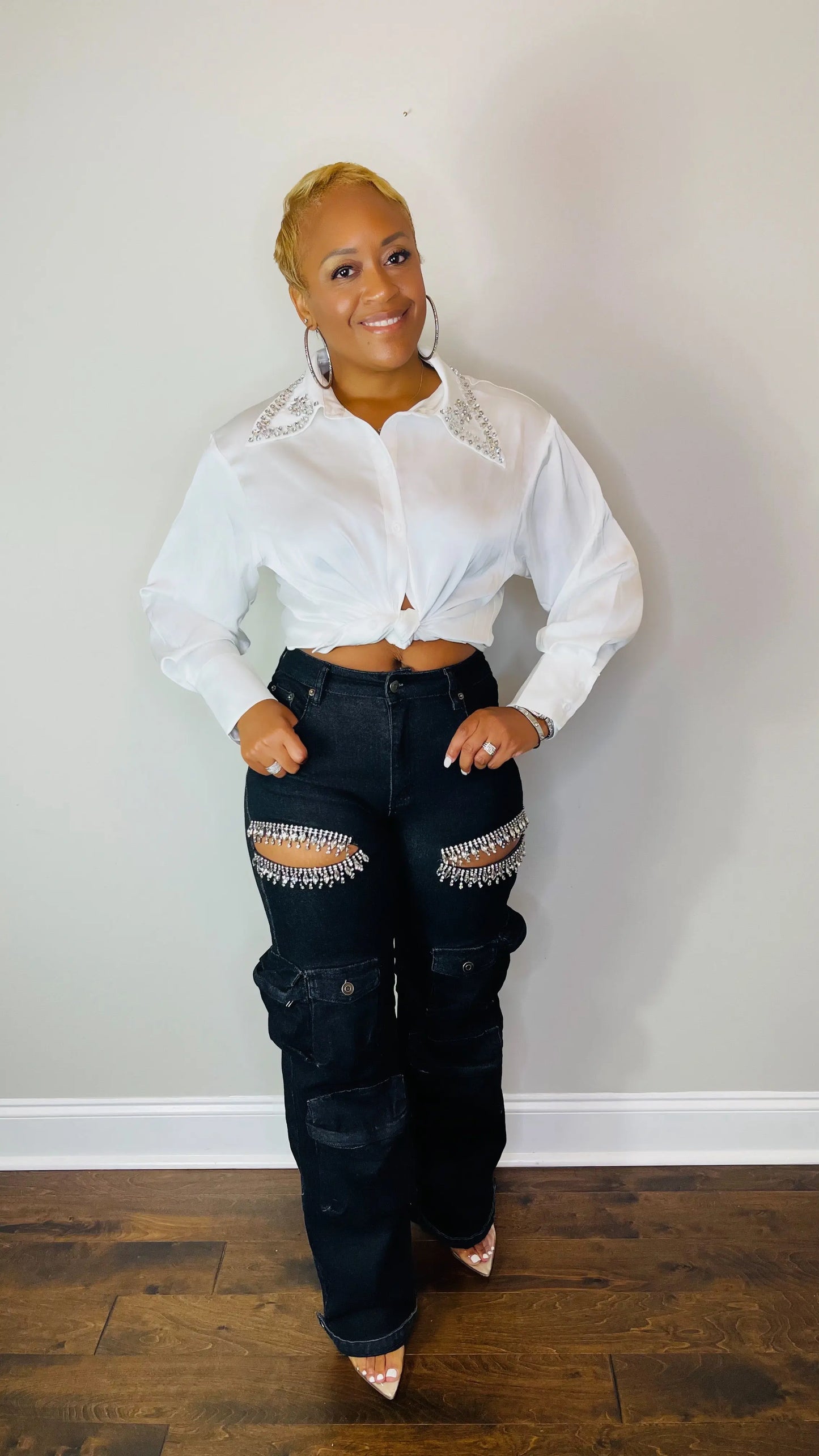 Take your cargos to another level with these black rhinestone embellished cargo jeans! Jeans feature a mid-thigh opening, adorned with beautiful rhinestones that have a flawless shine, adding a touch of femininity and chicness. Pants fit high waist, run true to size and hugs you in all the right places.